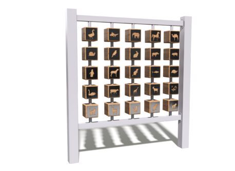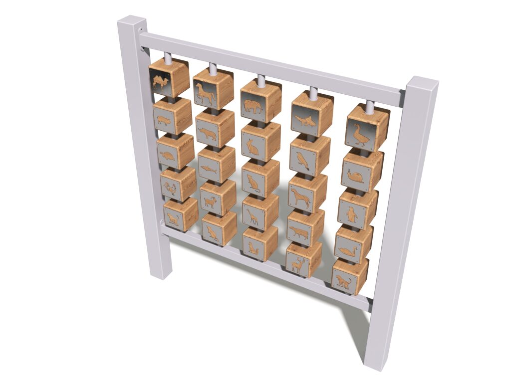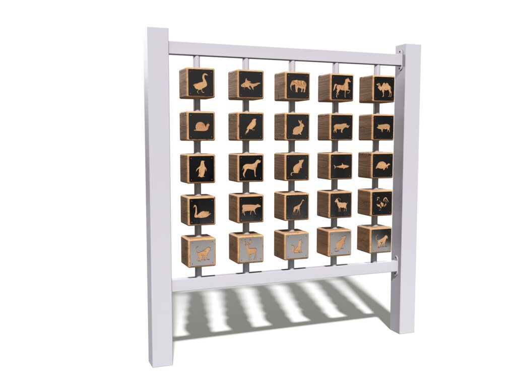Главная особенность панели — вращающиеся игровые кубики с животными. Они превращают обычную игру в увлекательный процесс: дети крутят их, собирают комбинации, придумывают собственные правила и сценарии. Такой элемент помогает развивать внимание, мышление и делает пространство площадки еще интереснее для ежедневных игр.
