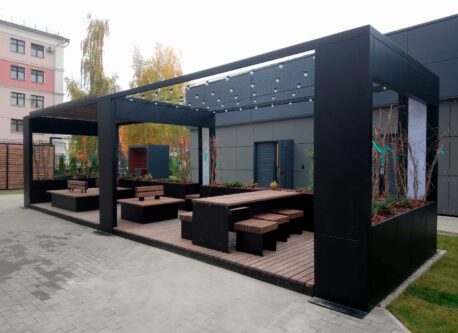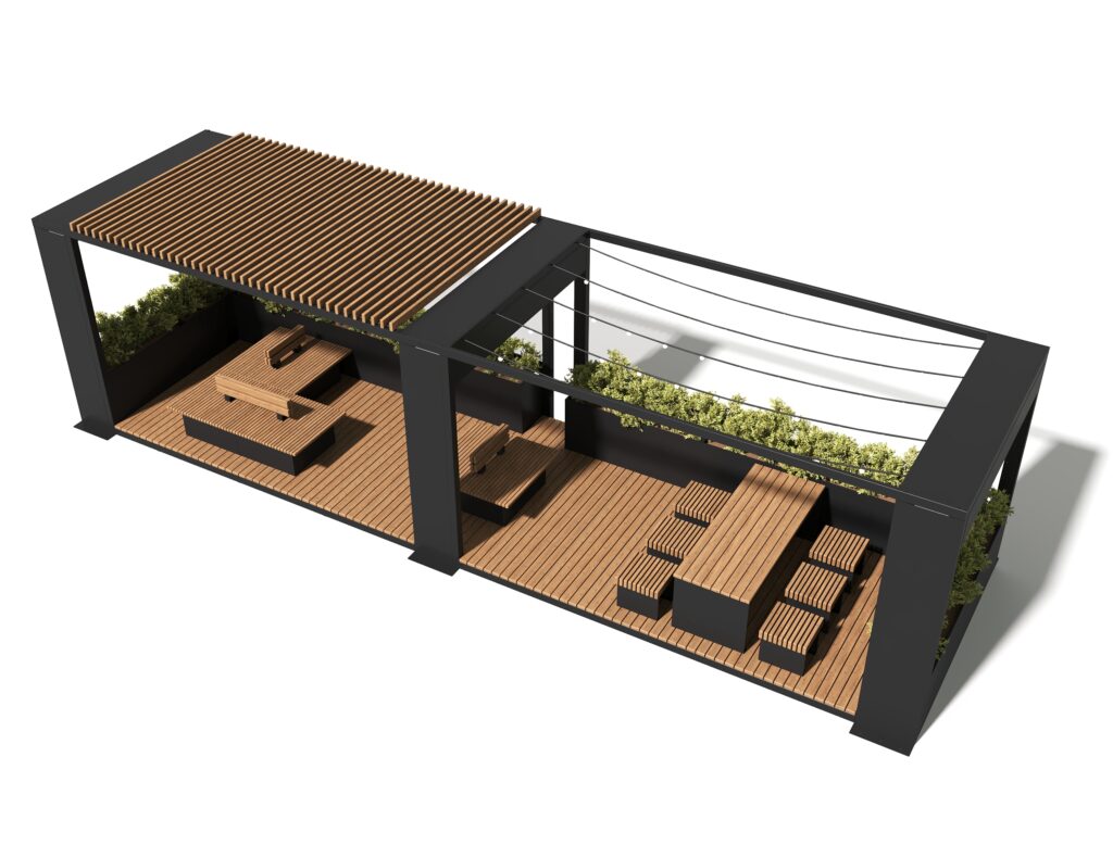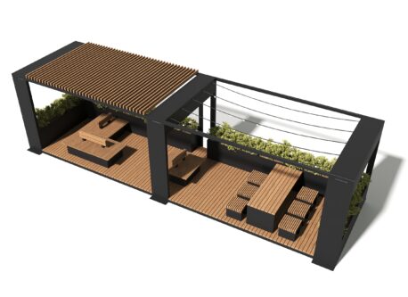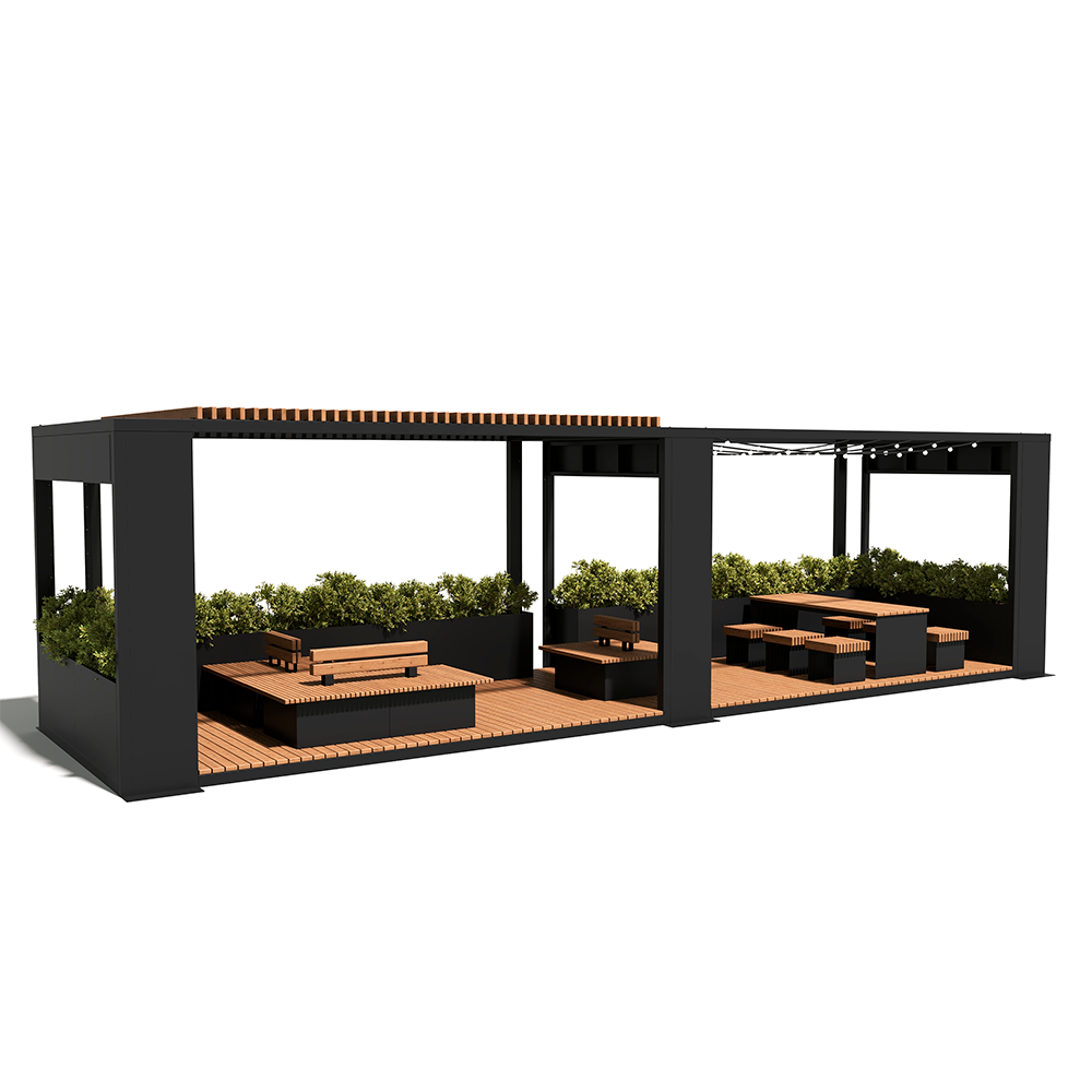 Превратите пустующую территорию в востребованную лаунж-зону, которая органично впишется в городской ландшафт или экстерьер заведения. Этот парклет — готовое решение для создания атмосферного пространства: интегрированные вазоны для живых растений создают уютный «зеленый щит», а продуманная комбинация столиков и скамеек позволяет с комфортом разместить сразу несколько групп посетителей.