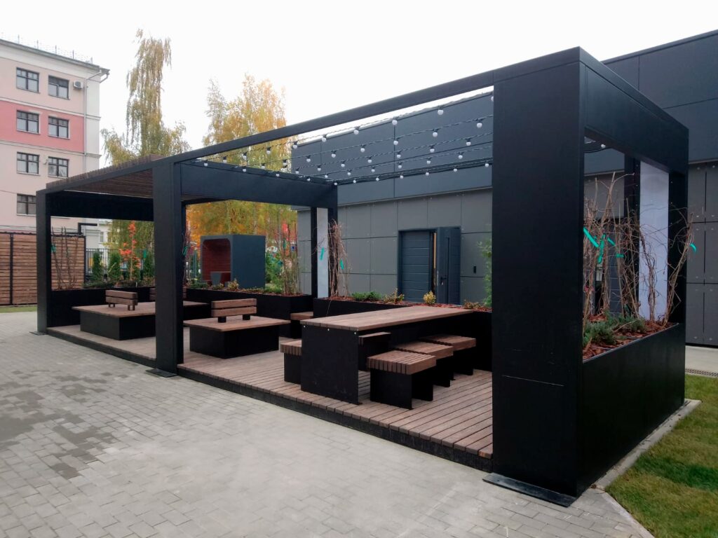 В основе конструкции лежит сверхпрочный металлический каркас с покрытием, устойчивым к коррозии и интенсивной эксплуатации в любых погодных условиях. Отделка из отборной древесины хвойных пород, обработанная специальным защитным составом, сохраняет эстетичный вид и приятную текстуру на протяжении многих сезонов.