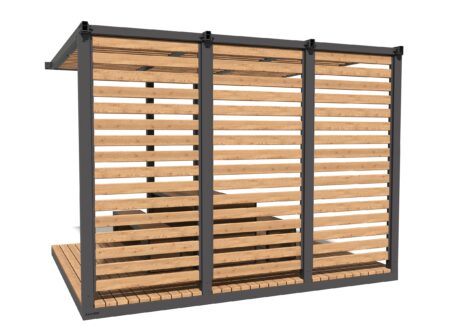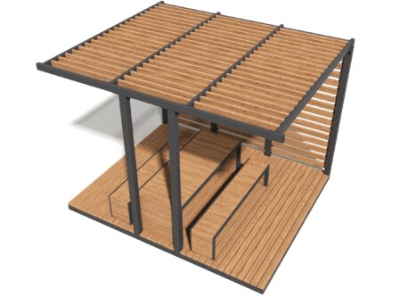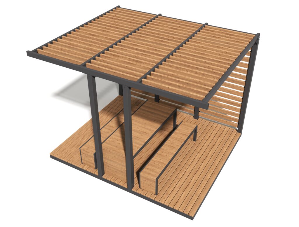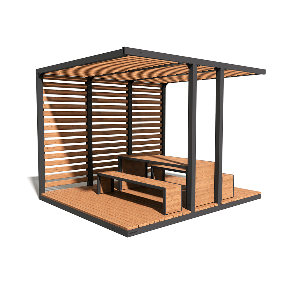 Пергола с продуманной геометрией создаёт полноценную зону отдыха — с защитой от солнца, ощущением уюта и приватности. Реечные стены мягко отсекают лишний шум и визуальный поток, а открытая кровля пропускает свет, формируя комфортную полутень. Внутреннее пространство уже организовано: здесь удобно разместиться для короткой паузы, общения или работы на свежем воздухе.