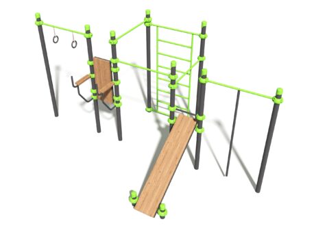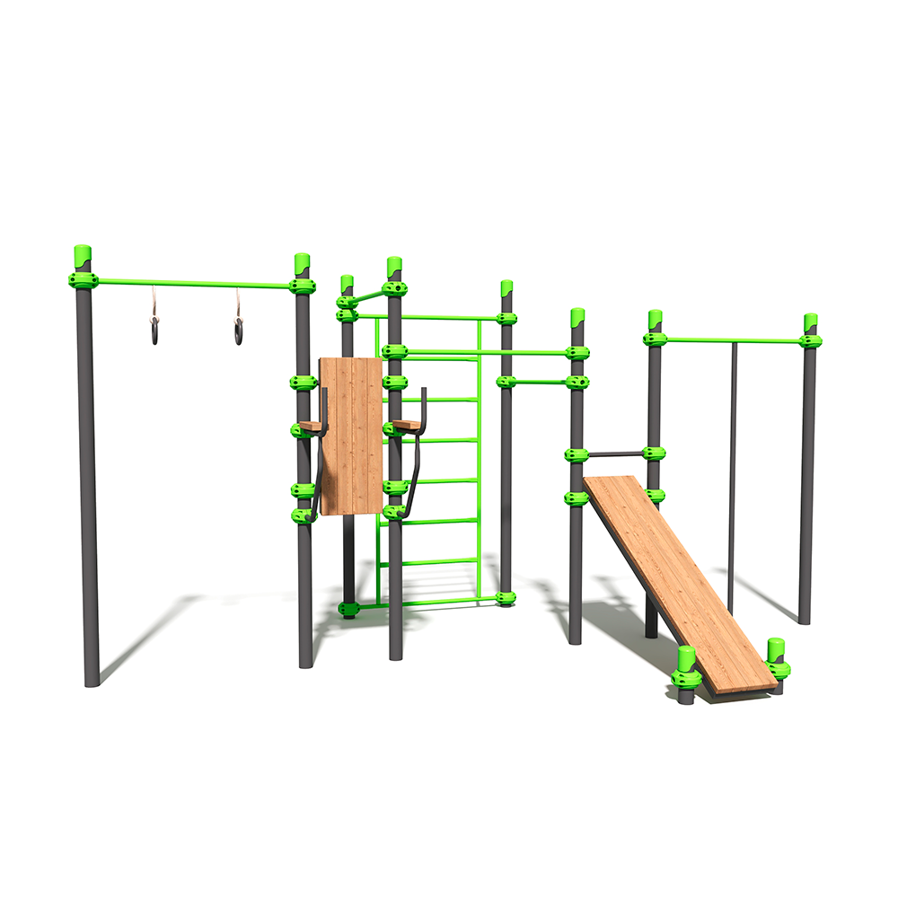 Этот универсальный воркаут-комплекс объединяет шведскую стенку, турники, кольца и скамью для пресса в единую зону для эффективных тренировок. Продуманная эргономика позволяет проводить комплексные занятия на все группы мышц — от базовых упражнений до сложных элементов. Это готовое решение для парков и жилых комплексов, которое мотивирует к активному образу жизни и выдерживает высокие эксплуатационные нагрузки.