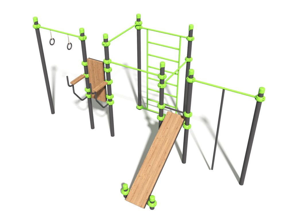 Конструкция выполнена из высокопрочного металла с износостойким порошковым покрытием, гарантирующим защиту от коррозии в любую погоду. Элементы из натуральной хвойной древесины обработаны специальным маслом для защиты от влаги и обеспечения комфортного, нескользящего хвата. Сочетание надежных материалов и эстетичного дизайна делает комплекс долговечной и выгодной инвестицией в современную спортивную инфраструктуру.